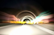 In entrambi i casi, lo spunto reale è quello del viaggio “on the road”, che diventa “segno grafico” in un caso la linea gialla che divide le due corsie di marcia di una strada di campagna bagnata dalla pioggia; nell’altro le luci di una galleria e il movimento relativo delle macchine (l’automobile e la fotocamera).