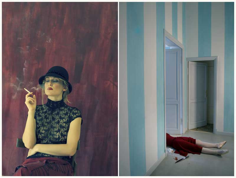 E’ uno spazio astratto, quello creato dall’autrice, fatto di colori che veicolano dritto dentro di noi la mutevolezza di uno stato d’animo; ma pure di linee prospettiche che talora lasciano l’occhio a scorrere in superficie (quasi dovesse arrendersi all’insondabilità di certe profondità). All’interno di tale spazio si muovono personaggi femminili, esemplari delle diverse declinazioni dell’“appartarsi in sé”, che chiamiamo solitudine: ciascuna di loro ha un proprio vissuto, oscuri desideri e paure, di cui l’immagine fotografica tenta di render conto attraverso un simbolismo denso di rimandi ad altri linguaggi.