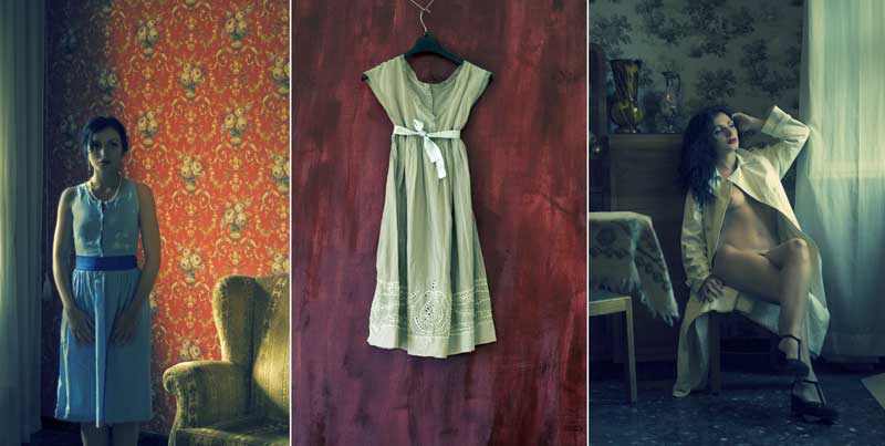 Ogni immagine è costituita da due o tre scatti, forti e semplici ad un tempo, ciascuno in sé capace di aprire una comunicazione diretta con il fruitore. Assemblati insieme non costituiscono vere e proprie sequenze, per quanto ci rimandino ad atmosfere cinematografiche; lo sguardo le percorre da sinistra a destra, per consuetudine, e tenta invano d’individuare un prima, un dopo, e una vicenda in atto. Nulla accade tuttavia; nessuna storia si dipana sotto i nostri occhi: solo un trascolorare delle pareti contro cui le donne si stagliano sembra scandire il loro mutevole umore in una dimensione altrimenti atemporale.